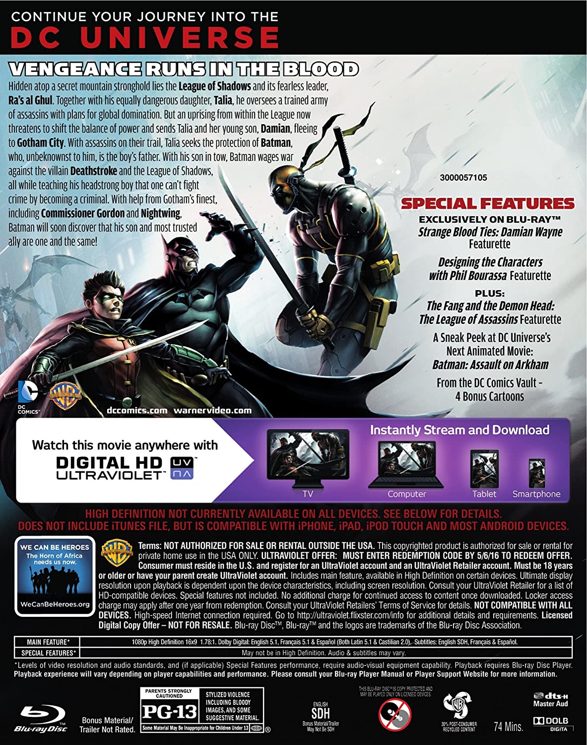 The Dark Knight (voice of Jason O'Mara) discovers that he has a son with Talia al Ghul (voice of Morena Baccarin), and that the young boy is driven by the same fiery vengeance as his crime-fighting father in this adaptation of the 2006 comic book arc by Grant Morrison. Trained as a young boy by the League of Assassins, Batman and Talia's son Damian (voice of Stuart Allan) grows convinced that his grandfather Ra's al Ghul was killed by the villainous Deathstroke (voice of Thomas Gibson). Donning Robin's suit, Damian sets out in search of violent retribution.~Jason Buchanan