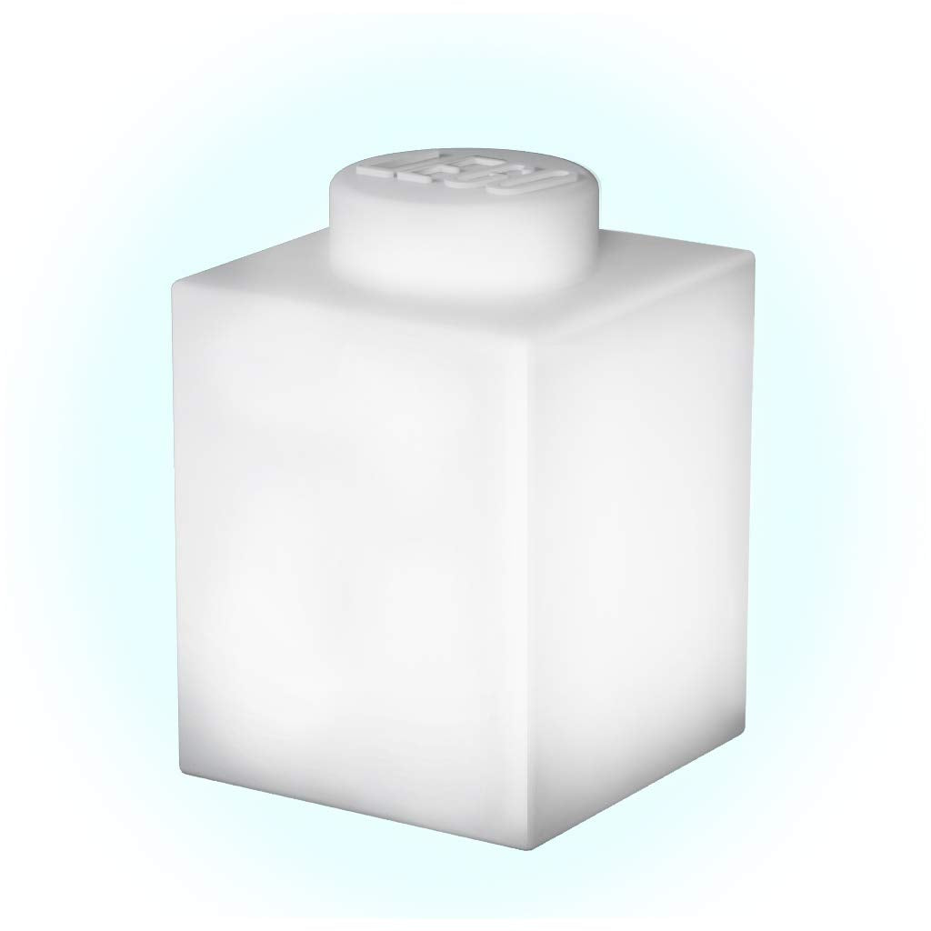 The white LEGO Classic 1x1 Silicone Brick NiteLite features an 8 color changing light module. Tap to change the color. Features two modes: Auto Color Changing and Manual Color Lock. 15 Minute Auto-Off feature. 3 x AAA batteries included. WARNING: CHOKING HAZARD -- Small parts. Not for children under 3 yrs. 3" x 3" x 4.5", Ages 6+ (LP40) Portable Flexible Nightlight for Kids Teens Bedroom and Gaming Room