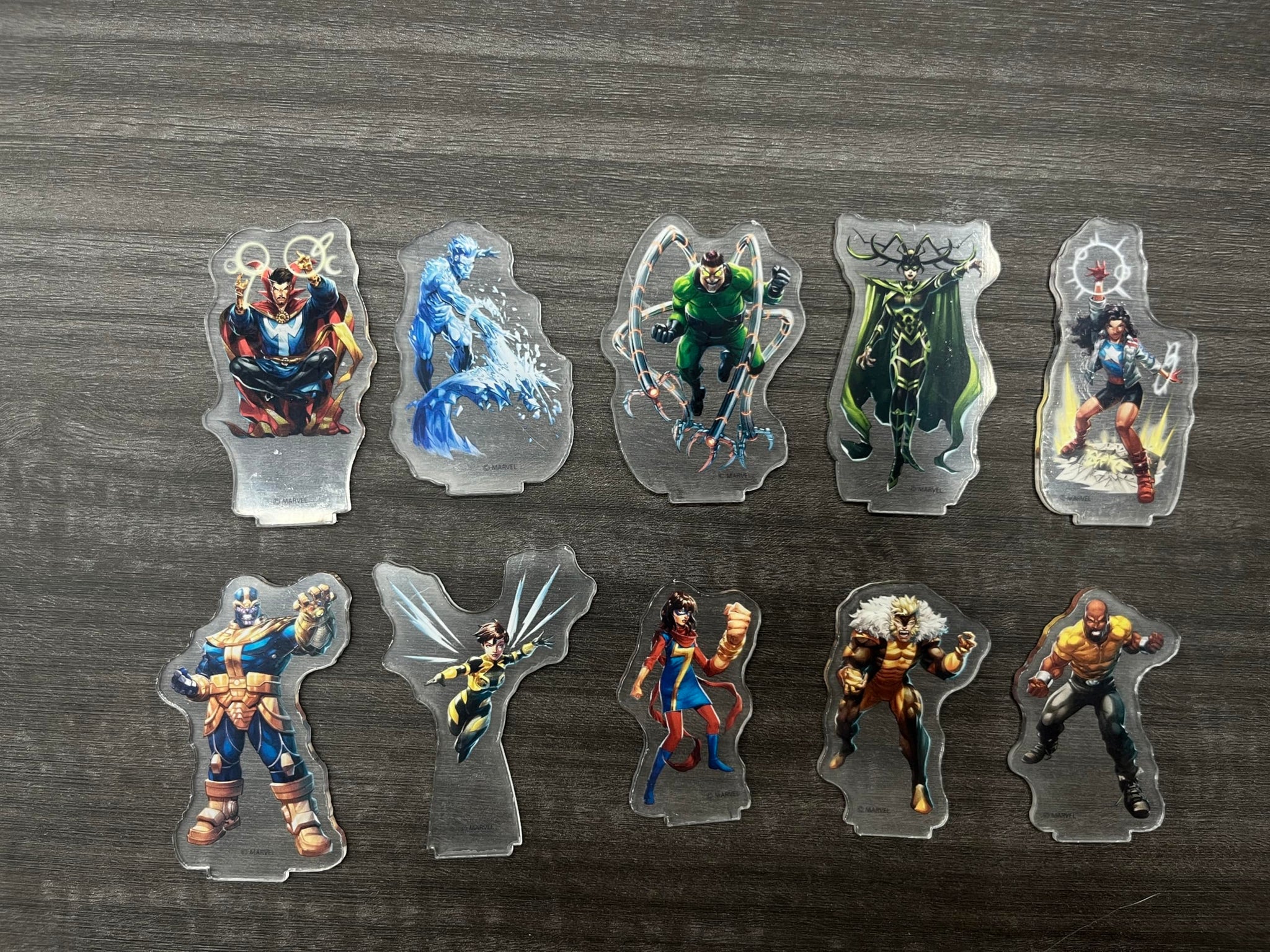 2D-Minis: 10 high quality Acrylic standees for the Marvel Multiverse Role-Playing Game. Featuring Heroes and Villains. With bases. Featuring: Iceman, Doctor Strange, Doctor Octopus, Luke Cage, Hela, America Chavez, Ms. Marvel (Khamala Khan), Wasp (Janet Can Dyne), Thanos, Sabretooth (Victor Creed).