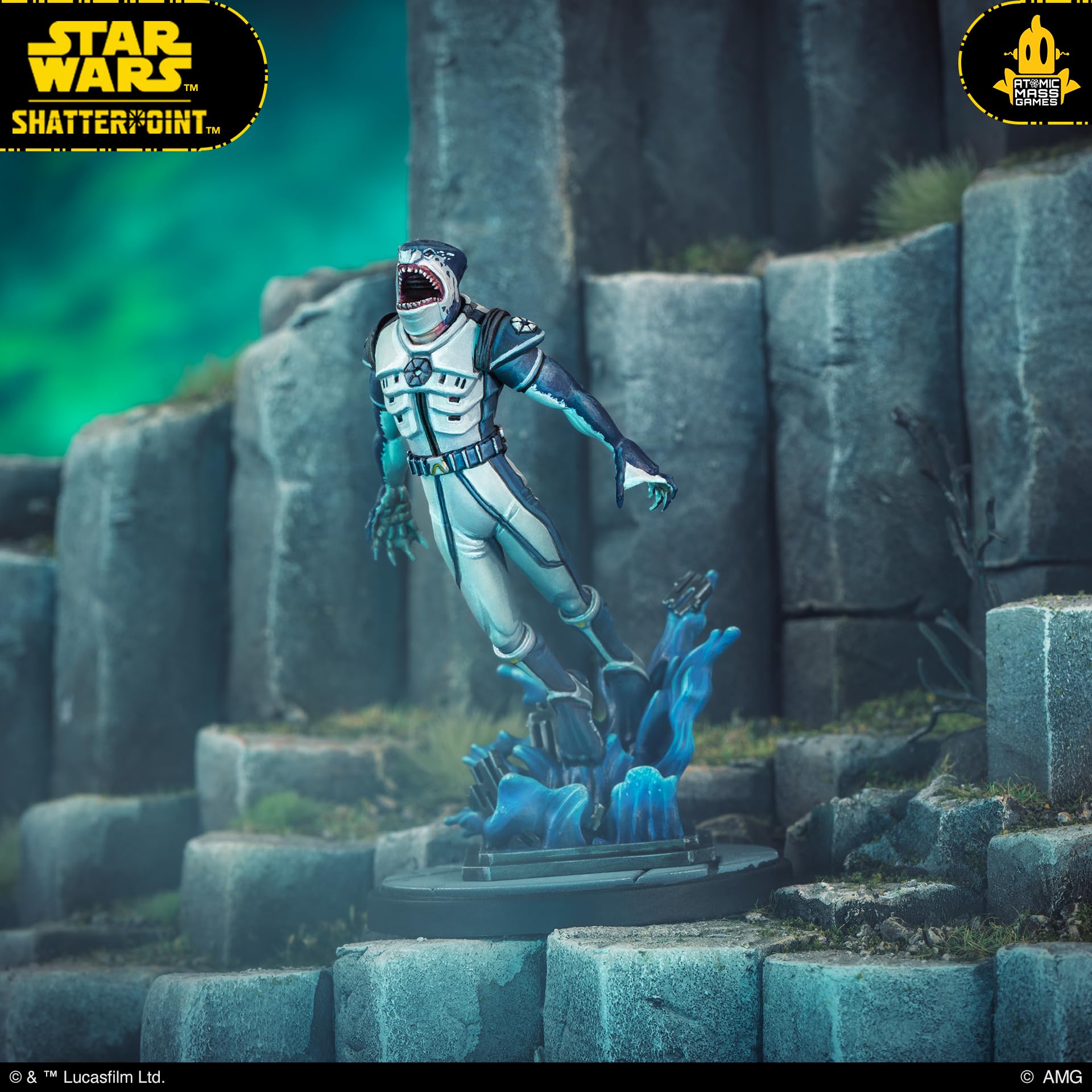 Riff Tamson brings the planet of Mon Cala into the Clone Wars. Conspiring with Quarren chieftain, Nossor Ri, these devious diplomats in service to the Separatist Alliance manipulate events and thrust their unwitting foes into the fray. Riff Tamson uses speed to surprise and cripple his foes while Nossor Ri grants additional bonuses when allies use elevation and terrain to their advantage. Rounding out the squad are Aqua Droids, which are highly durable fighters that excel at frontal assault.