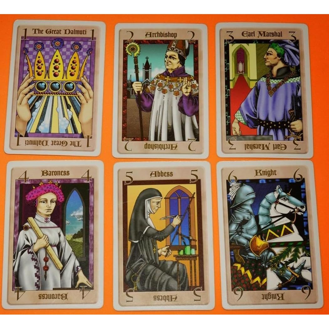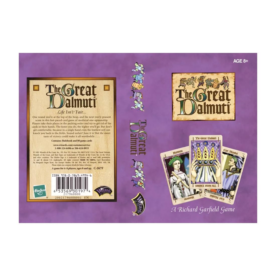 Product Description A light card game where players gain status by going out first. The 80-card commercial deck contains cards ranked from 12 to 1, along with two Jesters. Each card bears a number, which is not only its rank, but also tells you how many of that card exist in the deck. In other words, there are twelve 12s, eleven 11s, four 4s and a single card ranked 1. The lower the number, the better the rank. The deck is dealt out to all players and the object is to get rid of your cards as fast as possible. The hand begins with one person playing one or more card to the center of the table. The cards played must all be of the same rank (although Jesters are wild, and may be played with any other cards). Each player in turn must now either play the same number of cards of a better rank, or pass. Play continues around the table until everyone has passed; at that point, the cards are cleared and whoever played the last set of cards leads the next round. After everyone has gone out, the players are ranked. For example, the person who first got rid of all his cards becomes The Great Dalmuti. Players change seat position to represent the new hierarchy and begin another round. The Great Dalmuti is generally played for many rounds. From the Manufacturer Life isn’t fair. And neither is The Great Dalmuti. In one round you’re at the top of the heap, and in the next you could be peasant scum. In this fast-paced game of medieval one-upmanship, players take their places in the pecking order, from Greater Peon to Greater Dalmuti. But the roles change in every round, so get rid of the cards in your hand fast. The quicker you rid yourself of your cards, the higher you’ll go. But don’t get comfortable in the cushy Greater Dalmuti chair because even the lowliest peon can unseat you and boot you out the door. Sounds unfair, sure it is. But the sweet taste of victory could make it all worthwhile. This short, fast-paced, fun card game is easy to learn and play. It takes about 15 minutes to play the game, and is for 5-10 players.