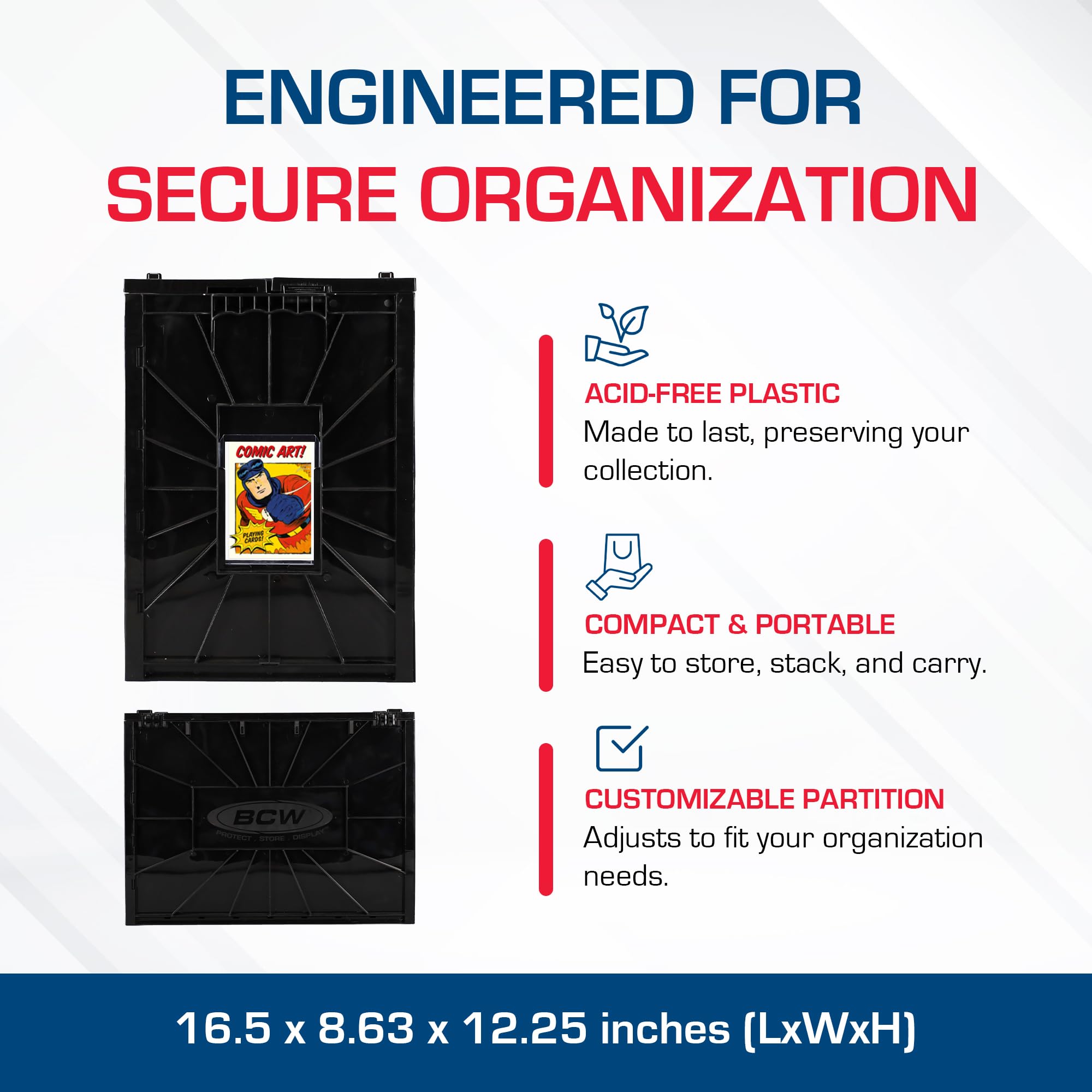 The BCW Short Comic Bin is a heavy duty comic box made from acid-free, reinforced, snap-together panels. The Comic Bin holds about 150 bagged and boarded comics and includes a movable partition that helps stand up your growing stack of comic books. Unfortunately, the comic bin is too small for storing golden age comic books; for that we recommend the Magazine Bin. Identification slots on the ends help you mark your boxes with either a 3"x5" index card or a toploading card holder. The lid panels feature sliding locks for added security.