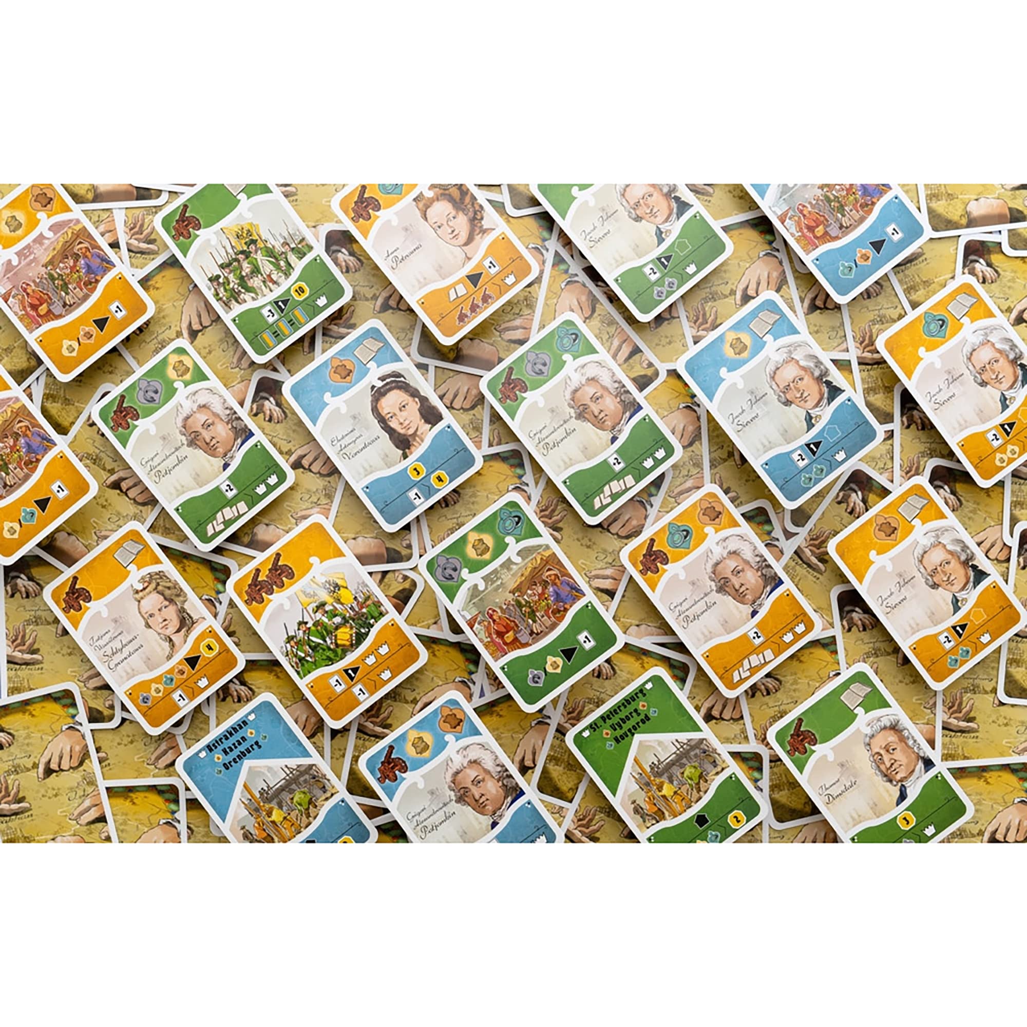 Catherine takes the players to the Tsarist Empire of 1762. Lovingly illustrated, up to 4 players try to win the Tsarina?s favor with the help of an innovative card mechanism. As is so often the case, different strategies lead to different goals: do you devote yourself to the development of the fine arts or trade, or perhaps you prefer to secure and thus perpetuate the empire? With a new card mechanism, you will continually find yourself in the dilemma of choosing to use your card for its action or use to activate your other cards! In the end, Catherine will decide whom she will place her trust. In this fast-paced game with an elegant ruleset, players will cleverly use their cards – either invest in building residents, collecting goods, or investing in military. The new card mechanic leads to interesting decisions, and with only 12 actions available for the game, every decision matters. Cards count for many things – they not only show actions you can take, but also other symbols that help boost other actions.