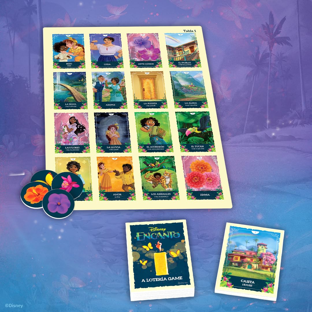 Gather around for fun and fortune with Disney Encanto: A Loteria Game! Joining your favorite Encanto characters, items, and places, and get ready to play in this English-Spanish version of Bingo, where players create rows or patterns out of matching images on their tablas to win!