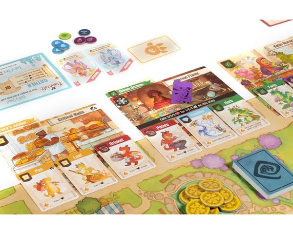 Artisan dragons, the smaller and magically talented versions of their larger (and destructive) cousins, are sought by shopkeepers so that they may delight customers with their flamecraft. You are a Flamekeeper, skilled in the art of conversing with dragons, placing them in their ideal home and using enchantments to entice them to produce wondrous things. Your reputation will grow as you aid the dragons and shopkeepers, and the Flamekeeper with the most reputation will be known as the Master of Flamecraft. In Flamecraft, 1-5 players take on the role of Flamekeepers, gathering items, placing dragons and casting enchantments to enhance the shops of the town. Dragons are specialized (bread, meat, iron, crystal, plant and potion) and the Flamekeepers know which shops are the best home for each. Visit a shop to gain items and a favor from one of the dragons there. Gathered items can be used to enchant a shop, gaining reputation and the favors of all the dragons in the shop. If you are fortunate enough to attract fancy dragons then you will have opportunities to secure even more reputation.
