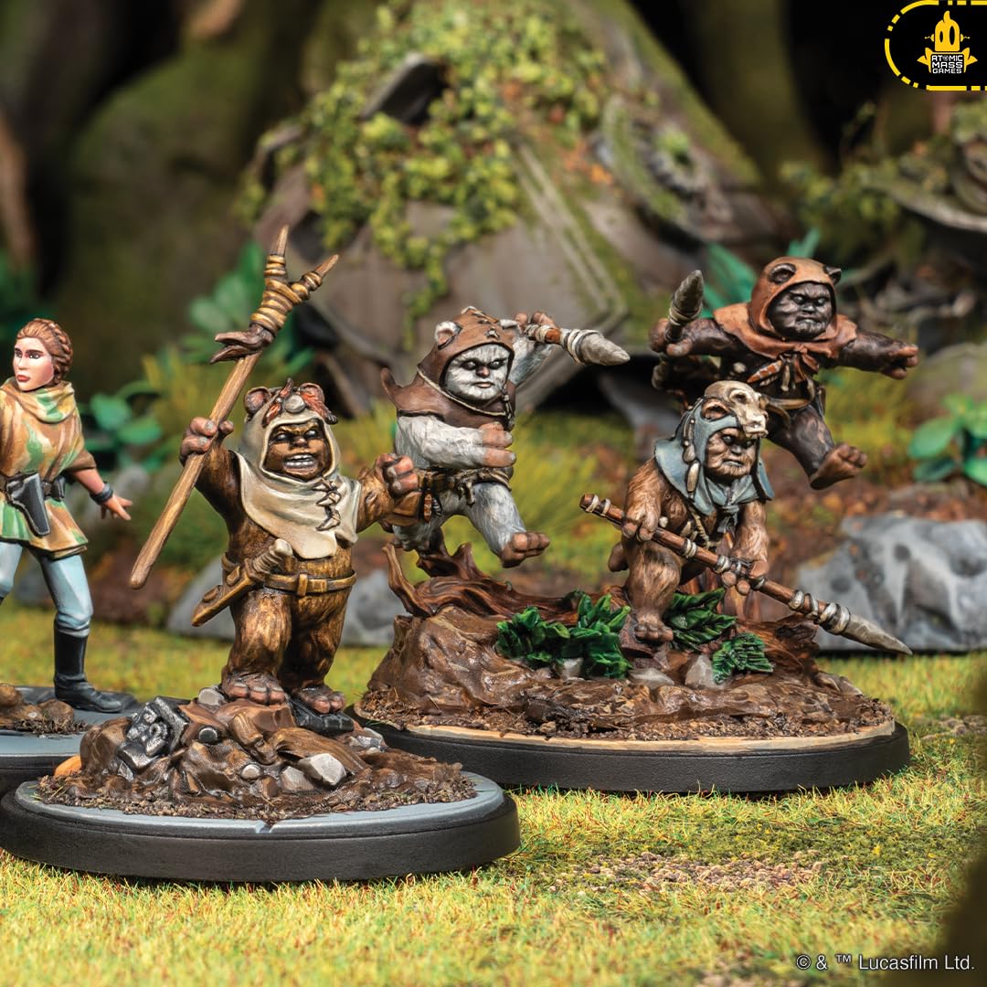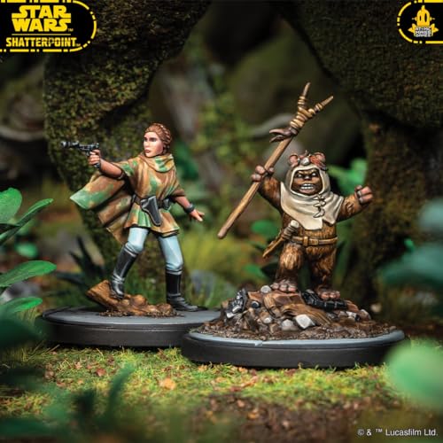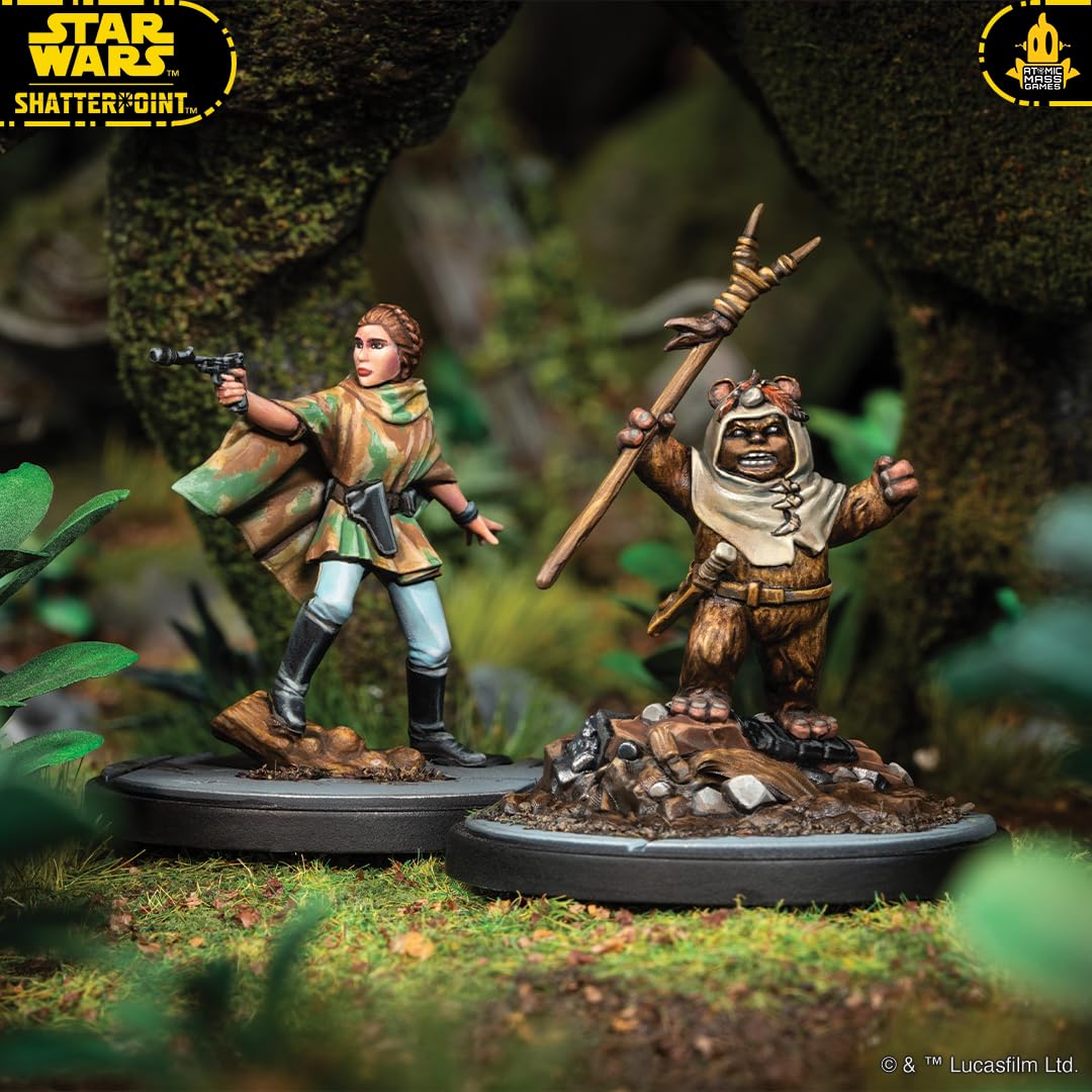 An iconic Rebel and her Ewok companions join Star Wars™: Shatterpoint in this new Squad Pack! Featuring both Leia Organa and Chief Chirpa as Primary Units, the Ewok Paploo as a Secondary Unit, and two Ewok Hunters wielding bows as Supporting Units, this pack gives players a variety of new options for creating Galactic Civil War-era squads. In addition to beautifully sculpted miniatures of these characters, this pack also includes all the Stat, Order, and Stance Cards players need to field them in battle.